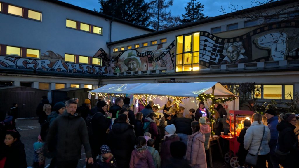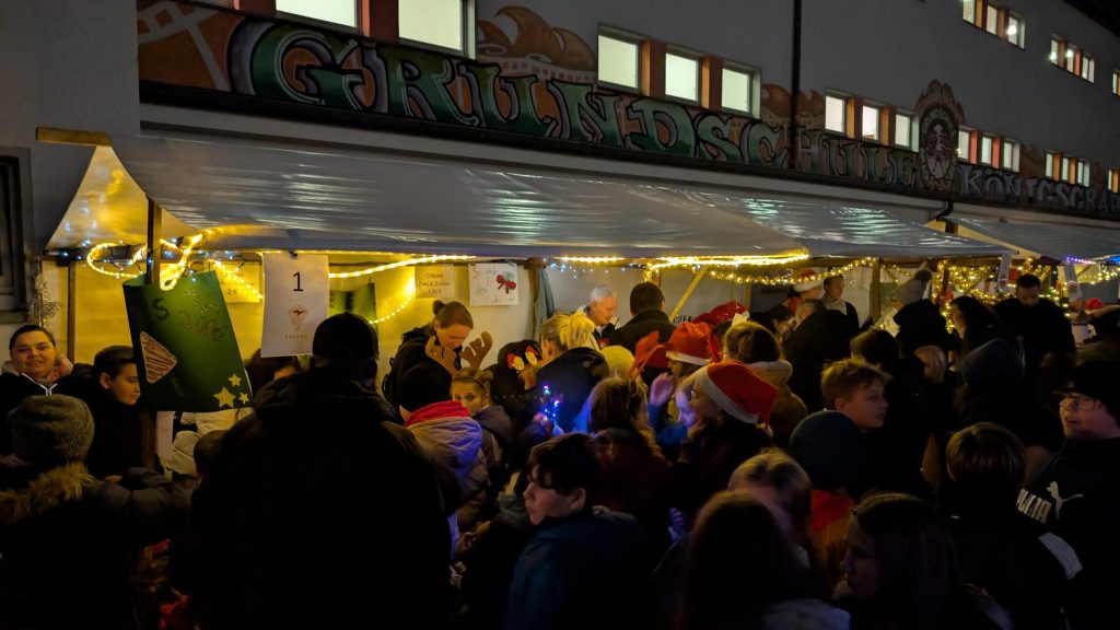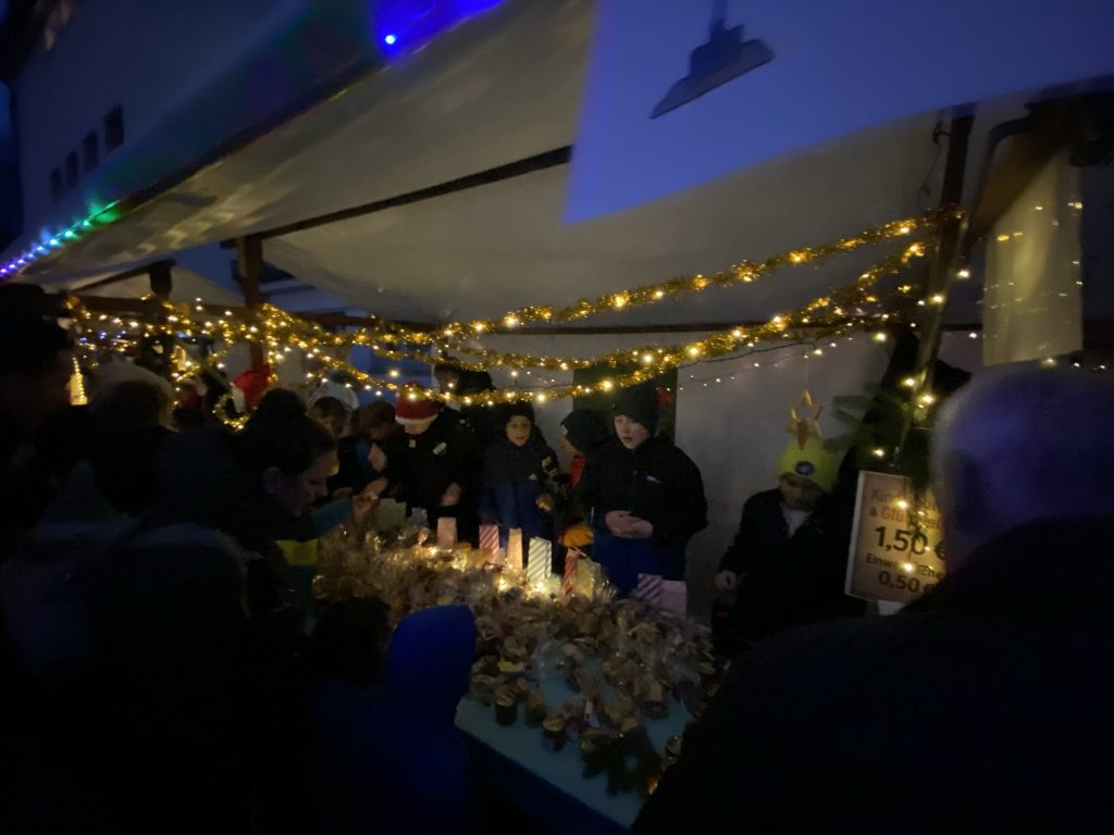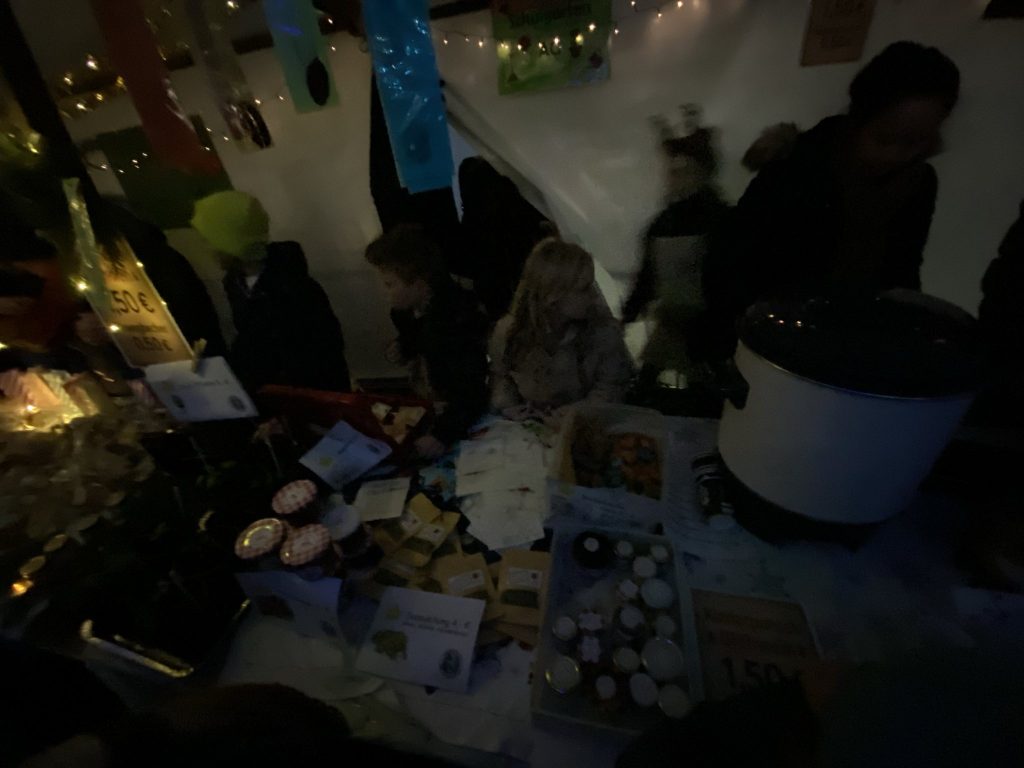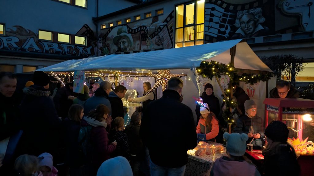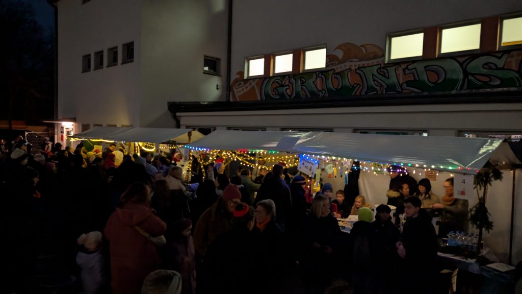 Unser Schulhof hat sich an diesem Abend in einen liebevoll gestalteten Weihnachtsmarkt verwandelt: Lichterketten, geschmückte Tannenbäume und zahlreiche Stände mit Leckereien sorgten für eine festliche Atmosphäre.