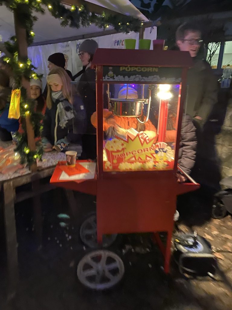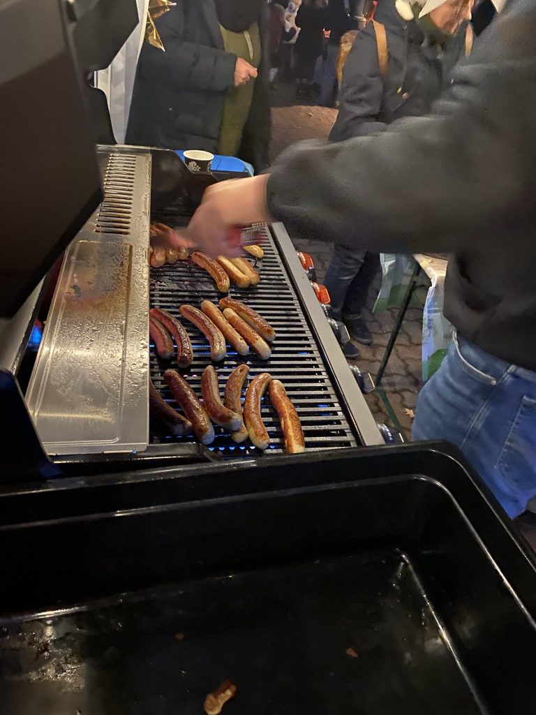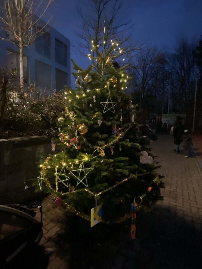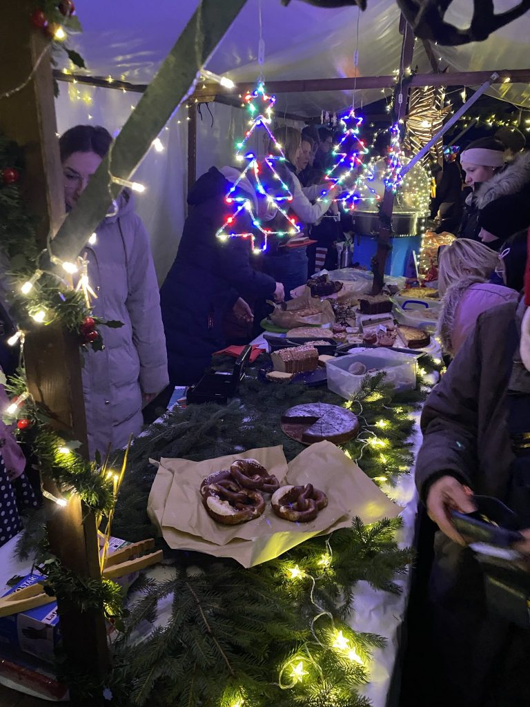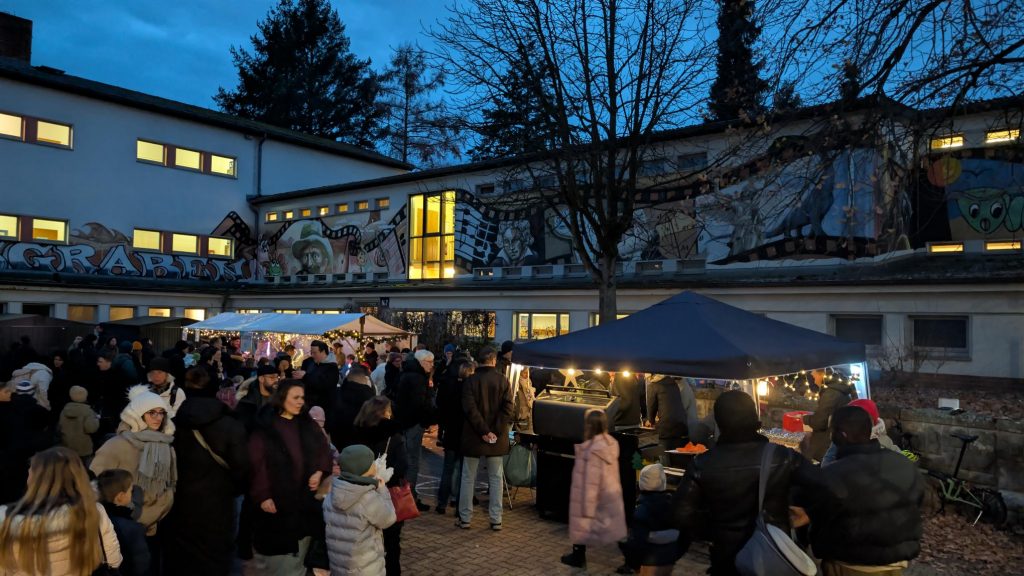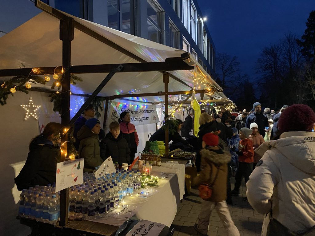 Unser Schulhof hat sich an diesem Abend in einen liebevoll gestalteten Weihnachtsmarkt verwandelt: Lichterketten, geschmückte Tannenbäume und zahlreiche Stände mit Leckereien sorgten für eine festliche Atmosphäre.