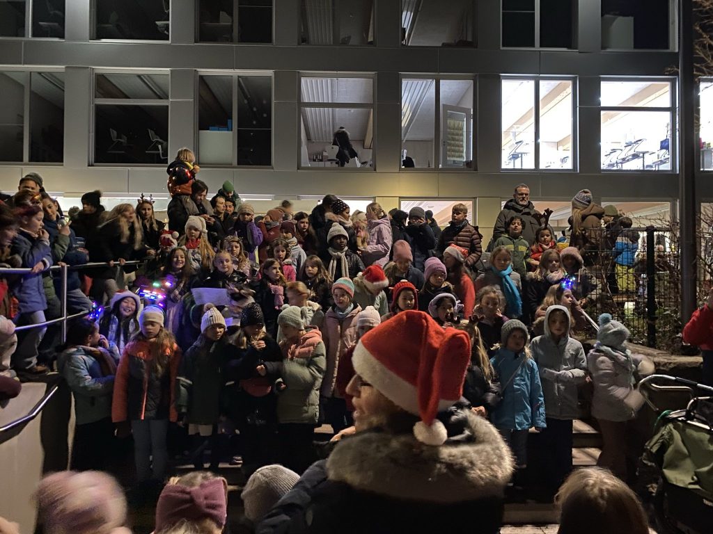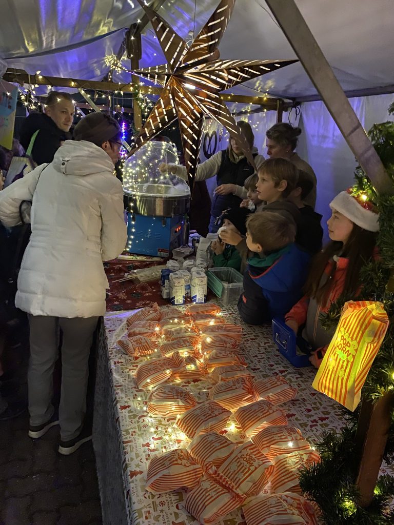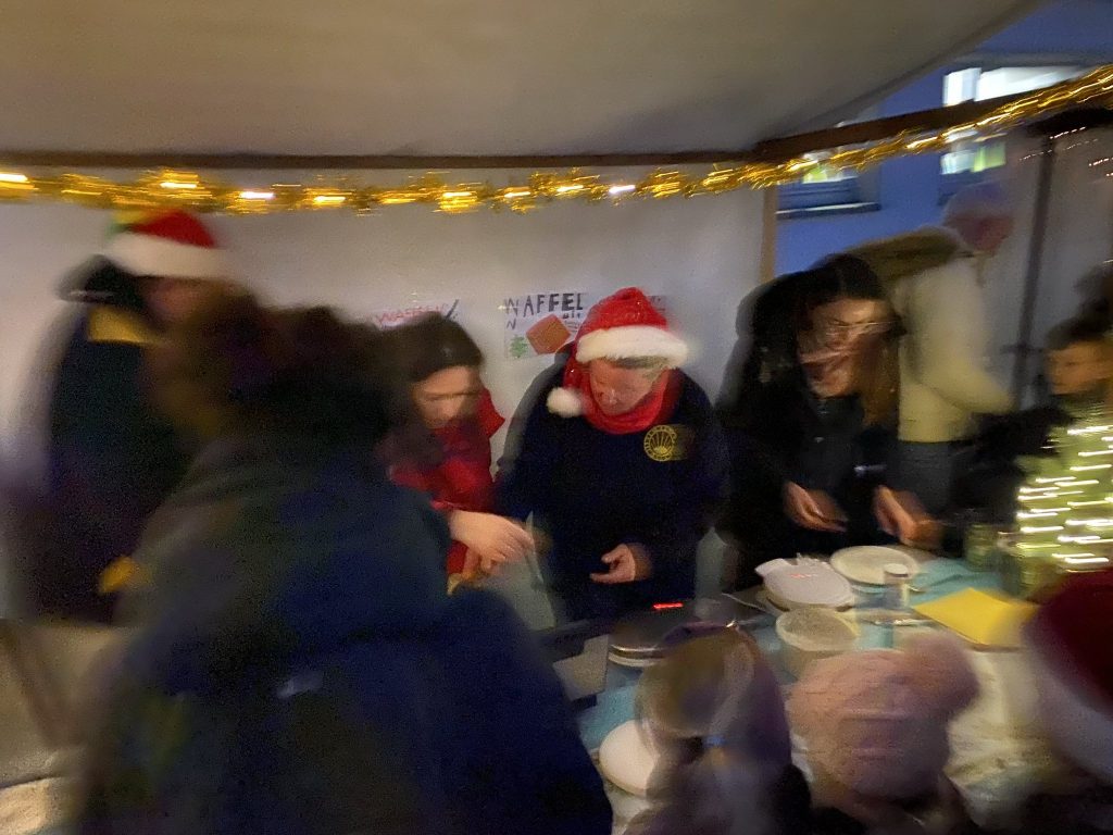 Familien, Kinder und Kollegium kamen zahlreich zusammen, um bei Waffeln, Crêpes, Popcorn, Kinderpunsch und vielen weiteren Köstlichkeiten miteinander ins Gespräch zu kommen und die Vorweihnachtszeit zu genießen.